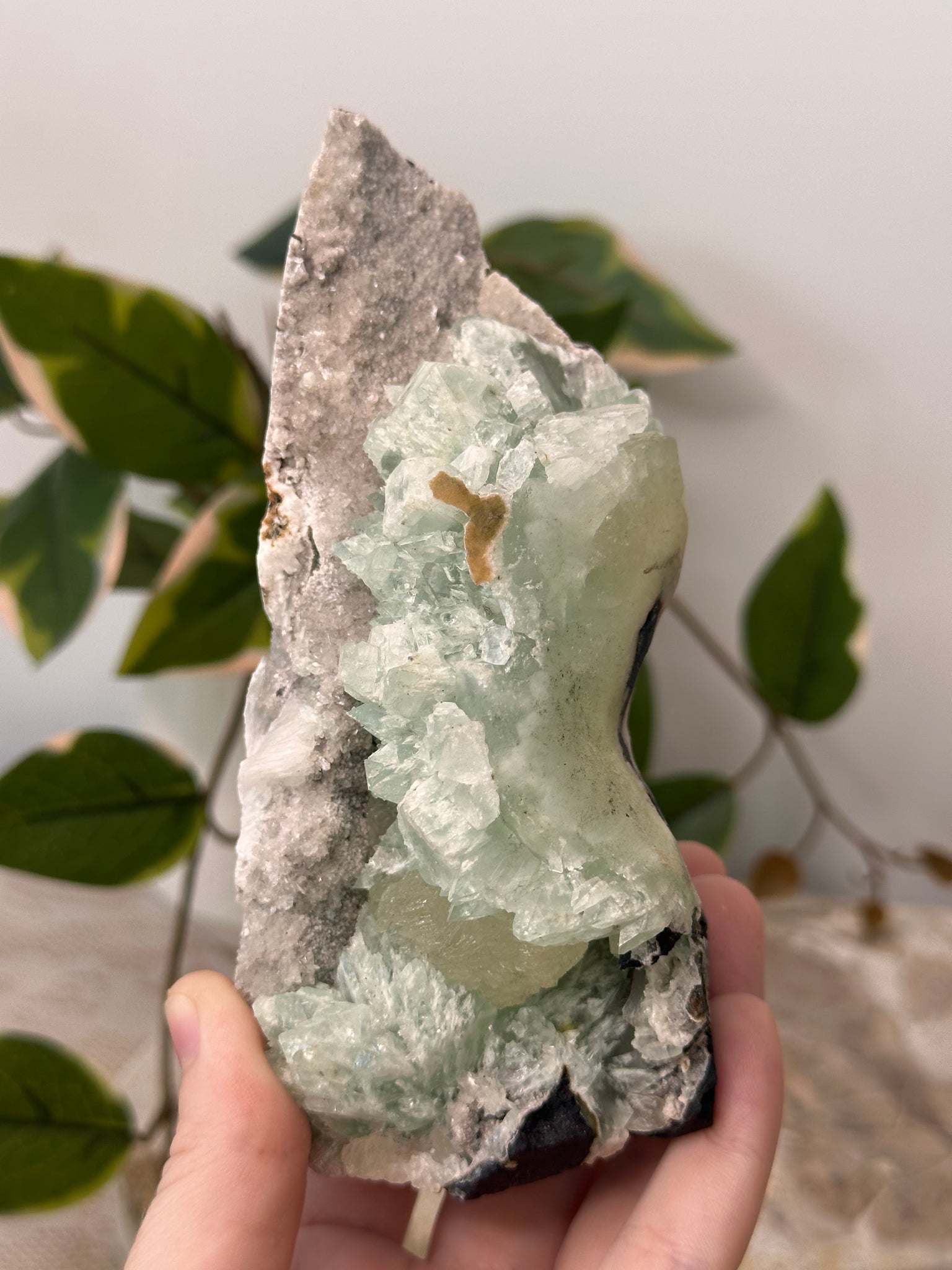 These Incredible Cut Bases have a shimmery Pastel Pink Chalcedony Base with crystallised Green Apophyllite forming on top. This piece has a chunk of calcite!
