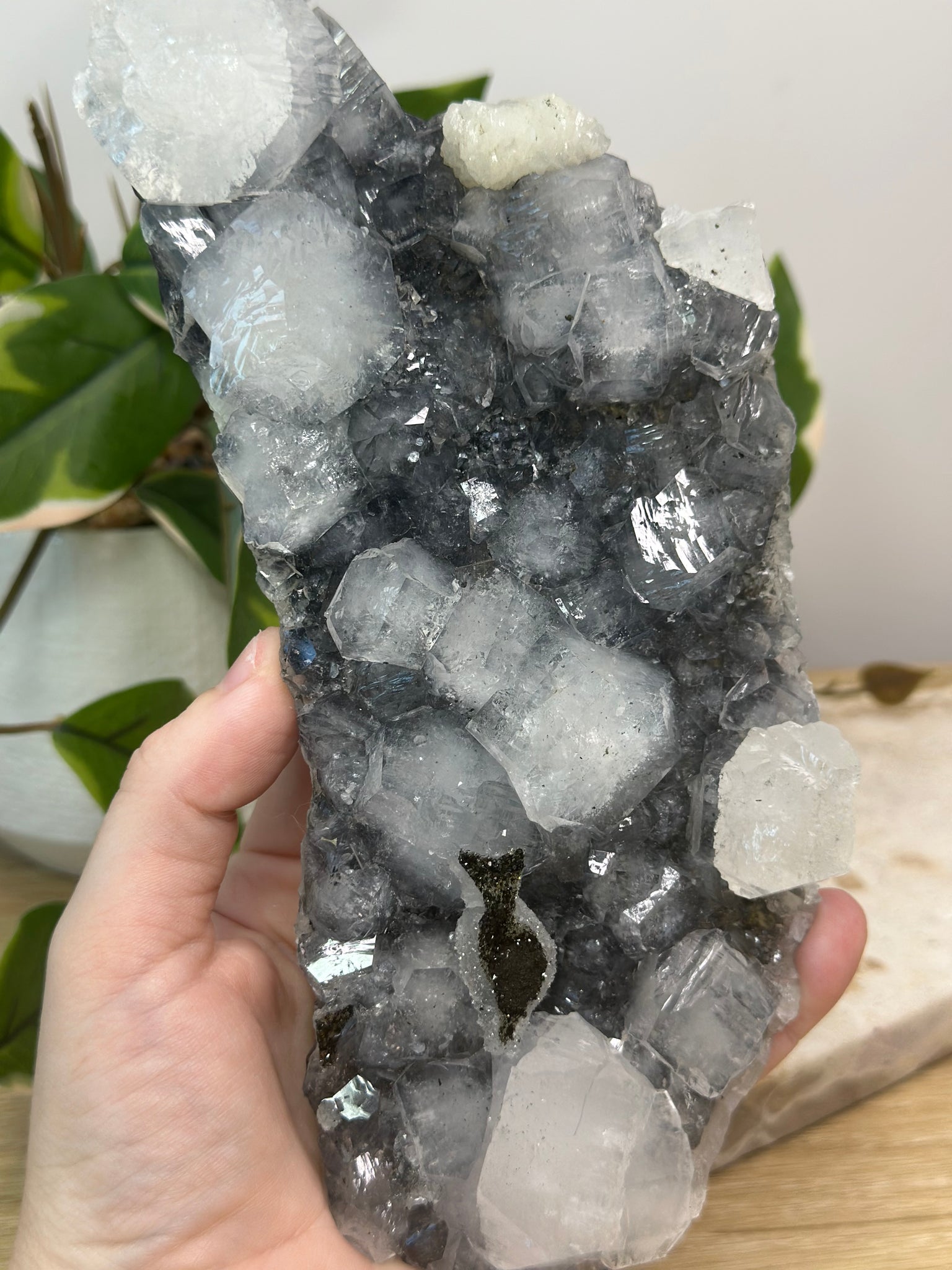Glassy Apophyllite embedded on top of a silver/grey/black chalcedony base!