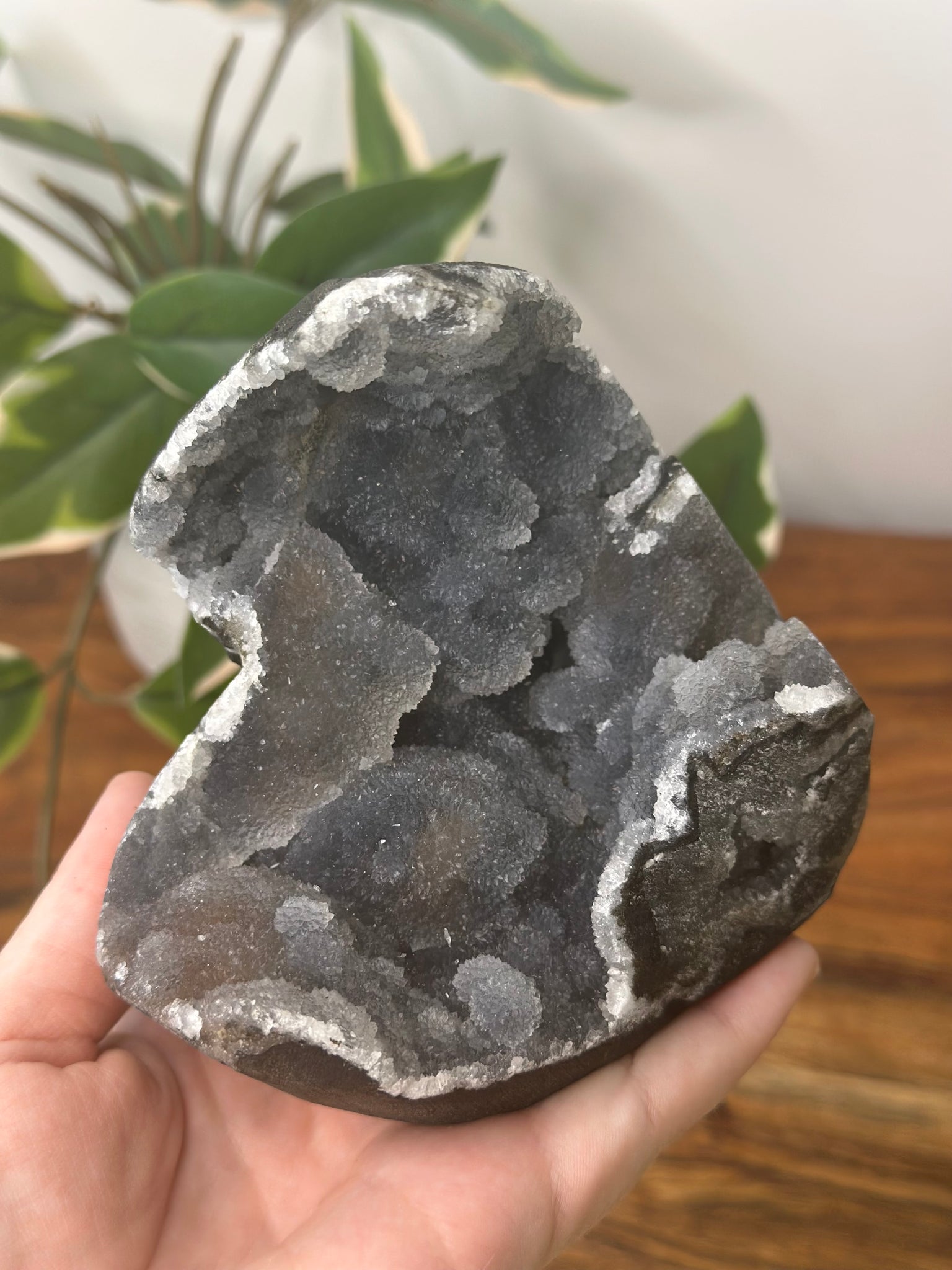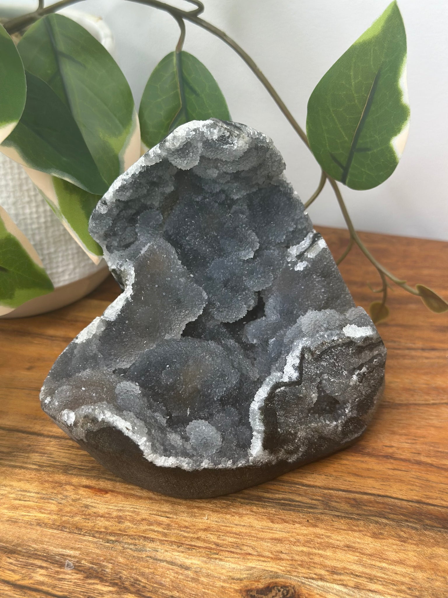 This Cluster has a shimmery Blue-Black Chalcedony with hues of red on the base.
