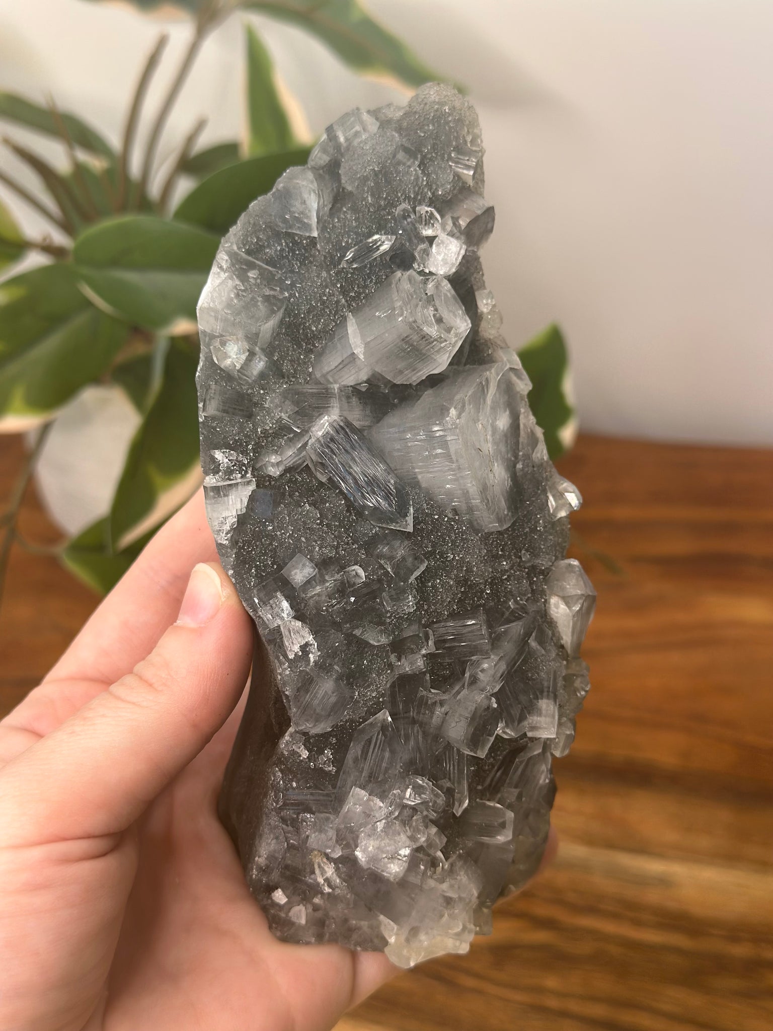 This Cluster has stunning growths of DT~Pointed formed Apophyllite on a shimmery Blue-Black Chalcedony base.