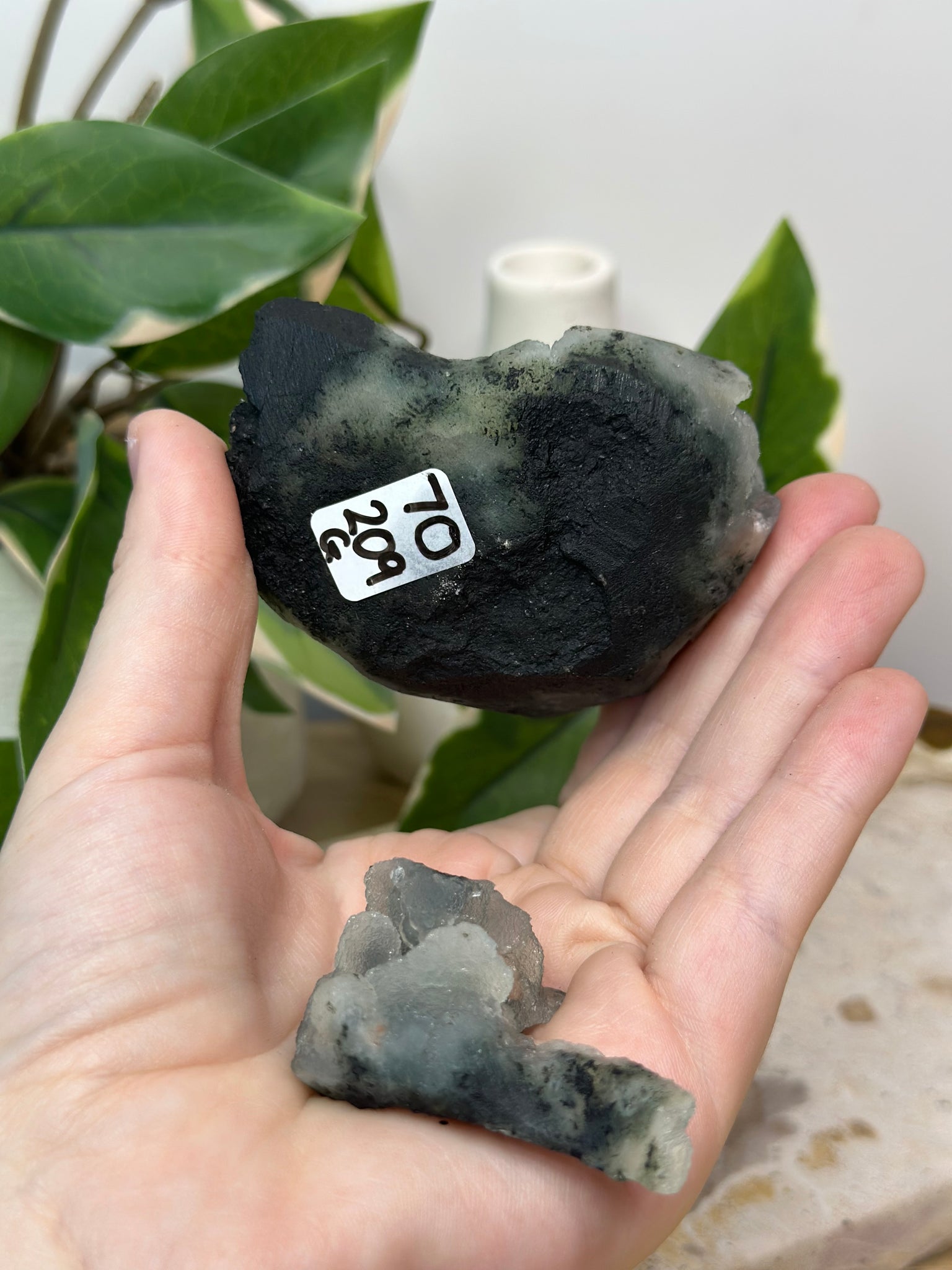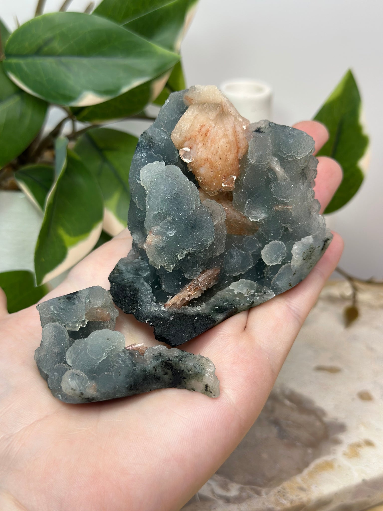 This is a velvety/sparkly, blue/green chalcedony base, that has fans of peach stillbite and gorgeous small apophyllite growths.