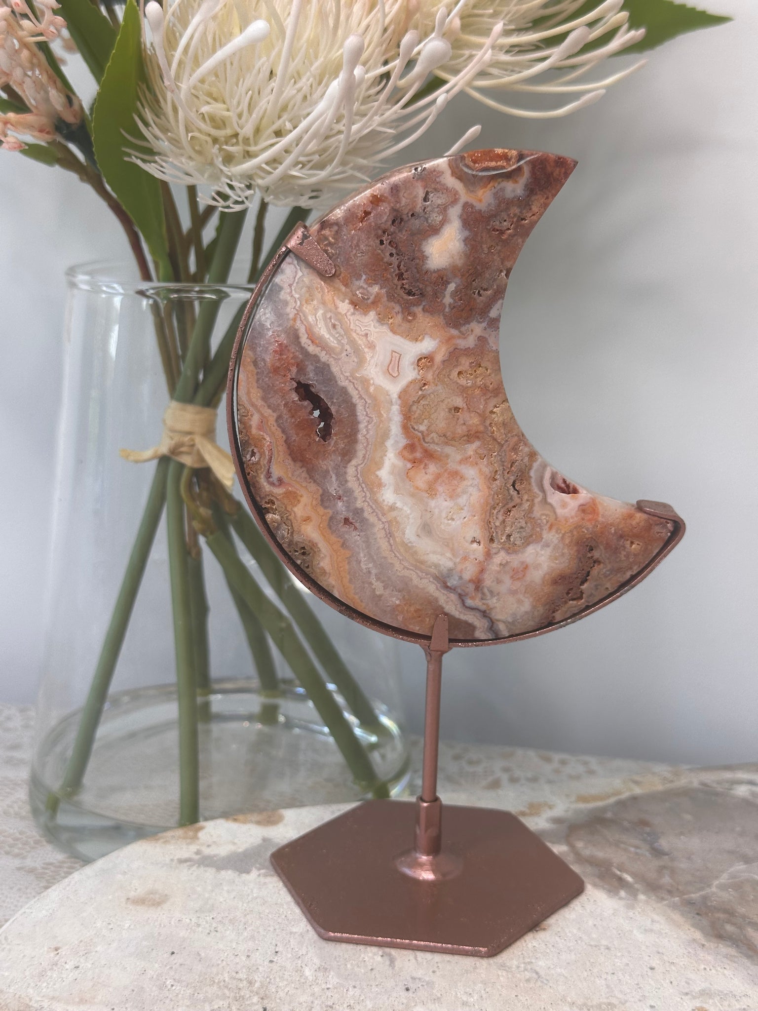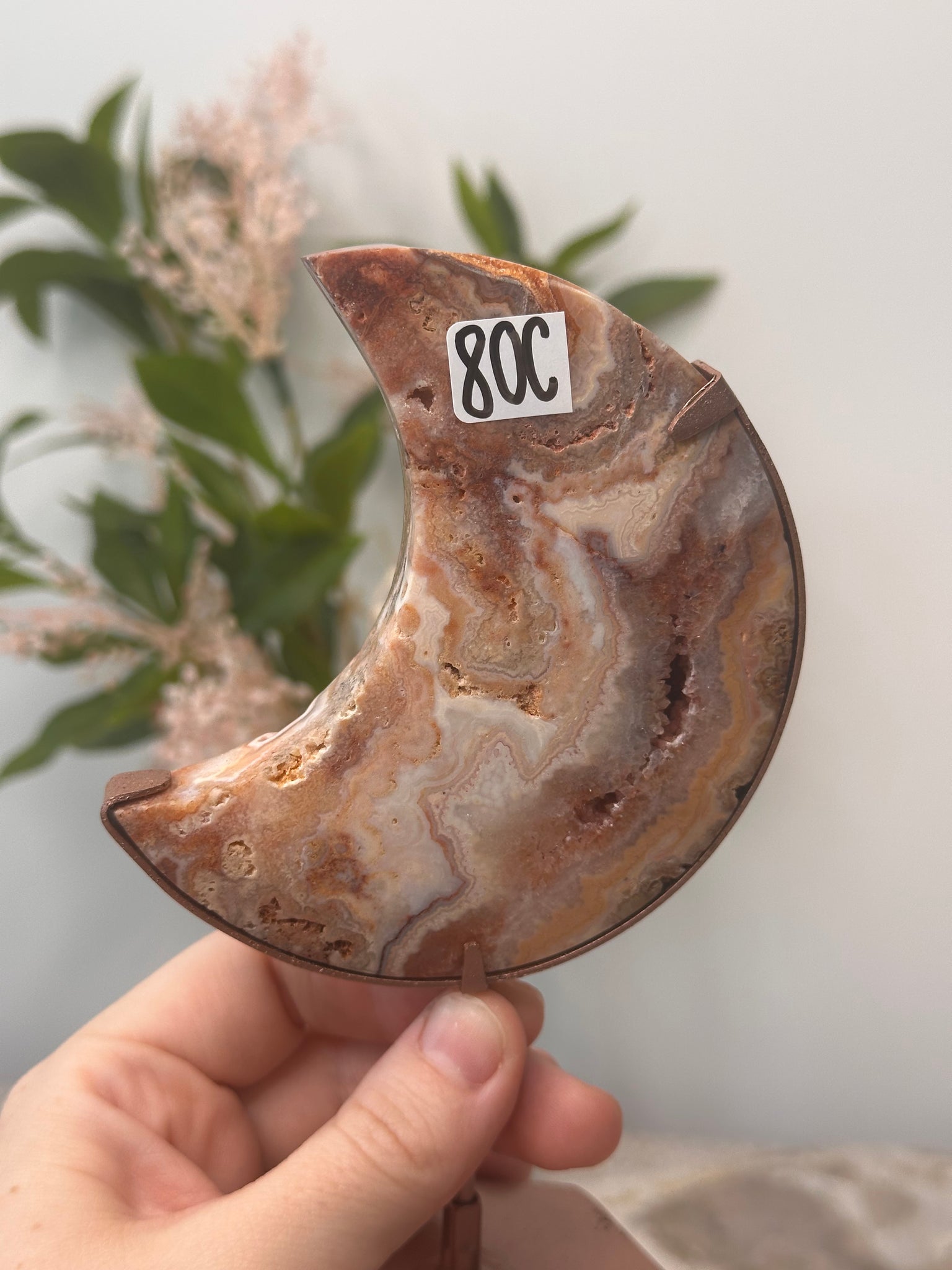 Pink Crazy Lace Agate Moon On Stand #80C