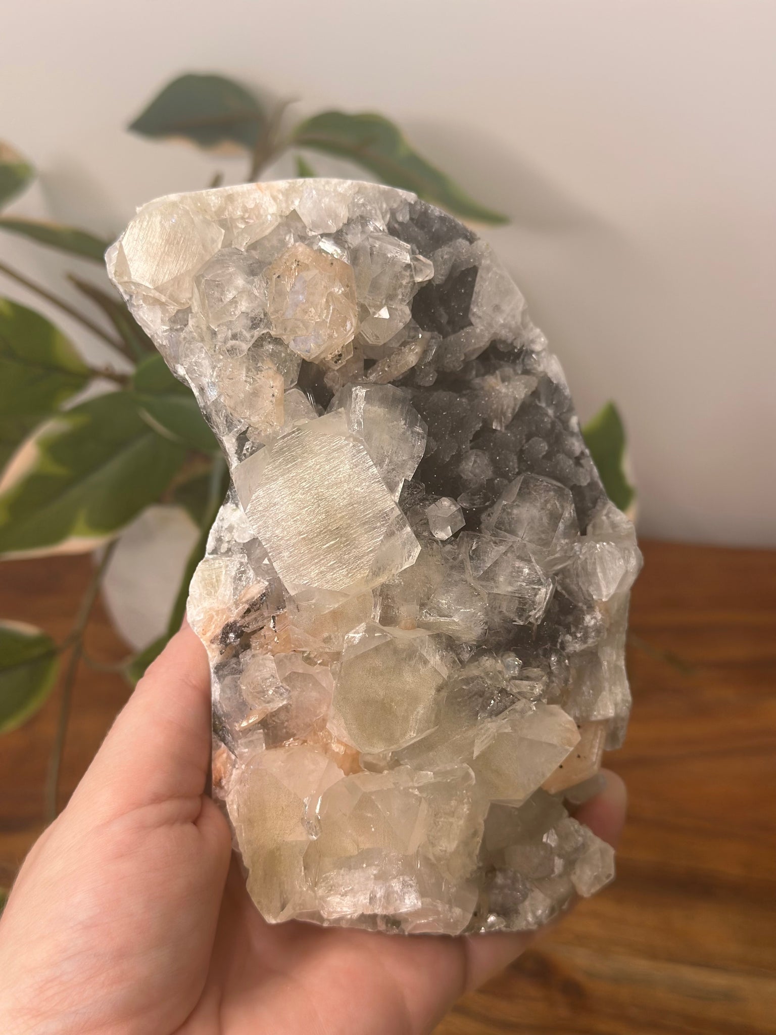 This Cluster has stunning growths of peachy Stilbite with a glittering Blue-Black Chalcedony base and stunning Glassy Green-Clear Apophyllite.