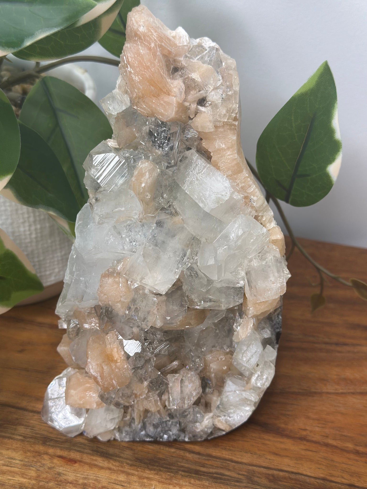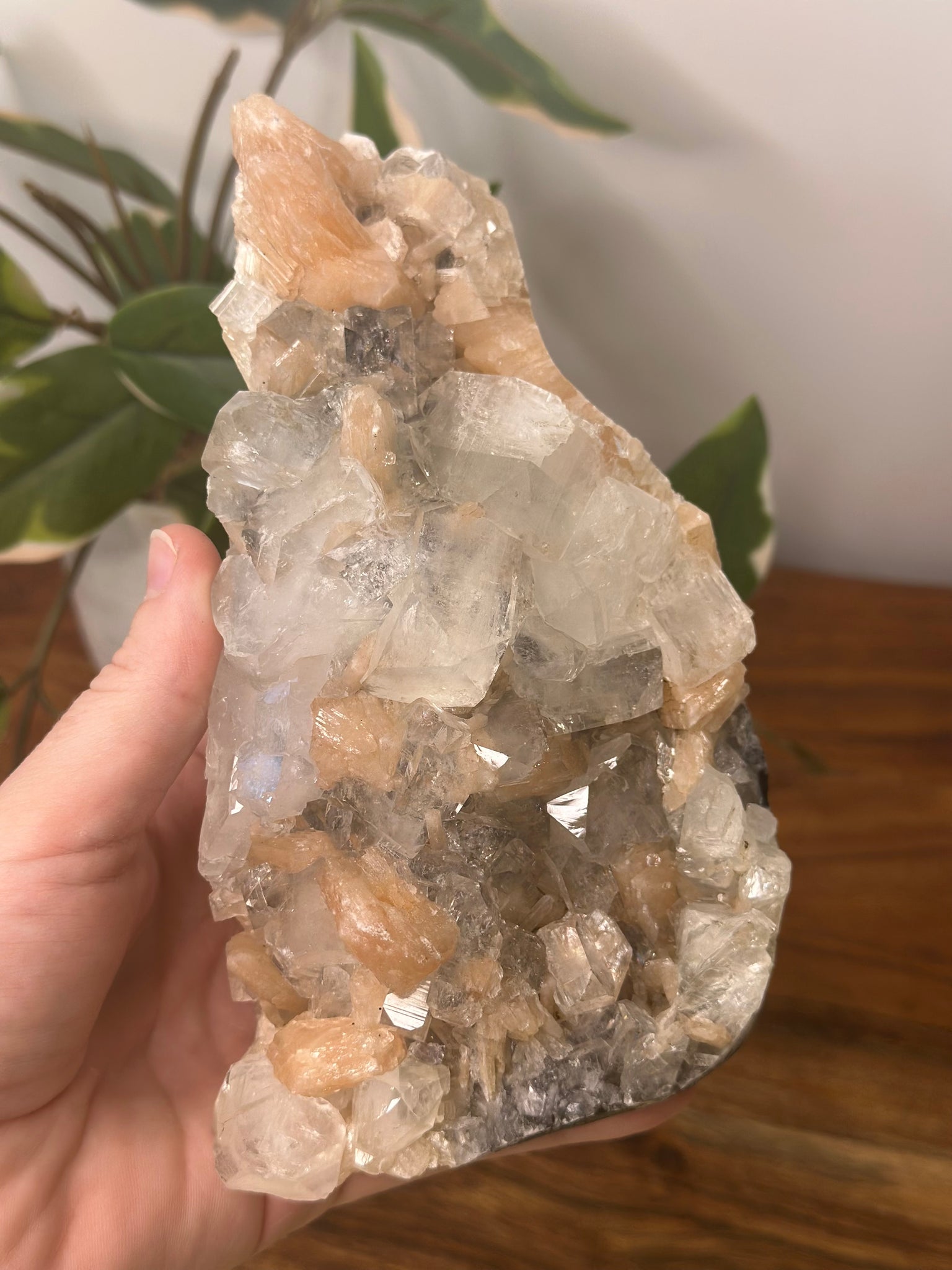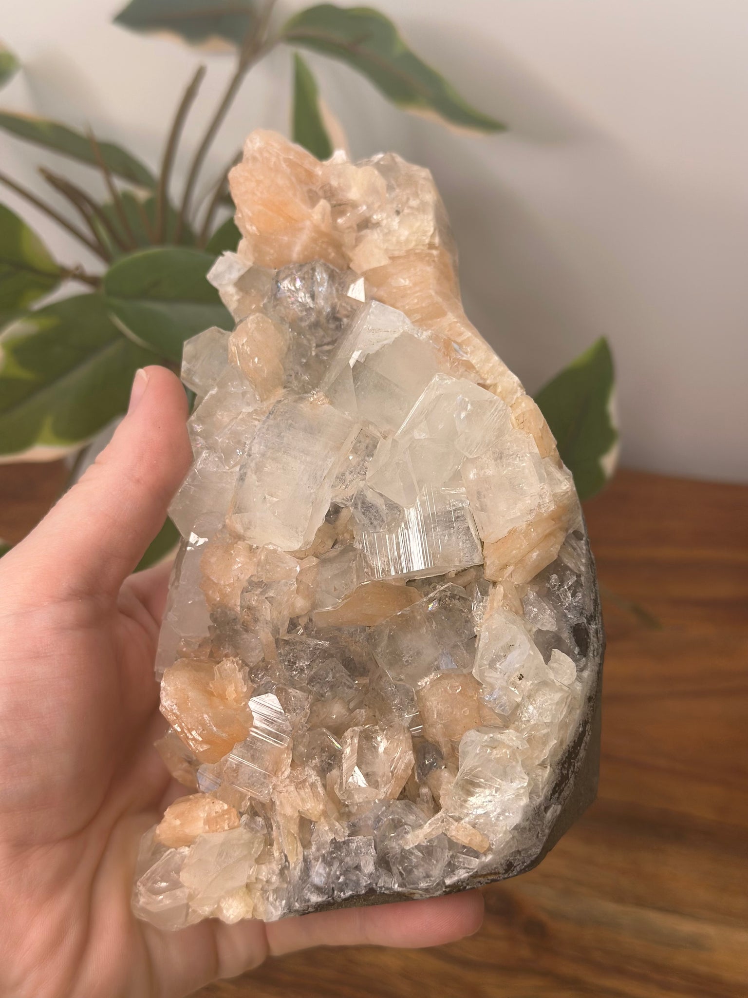This Cluster has stunning growths of peachy Stilbite with a glittering Blue-Black Chalcedony base and stunning Glassy Clear Apophyllite.