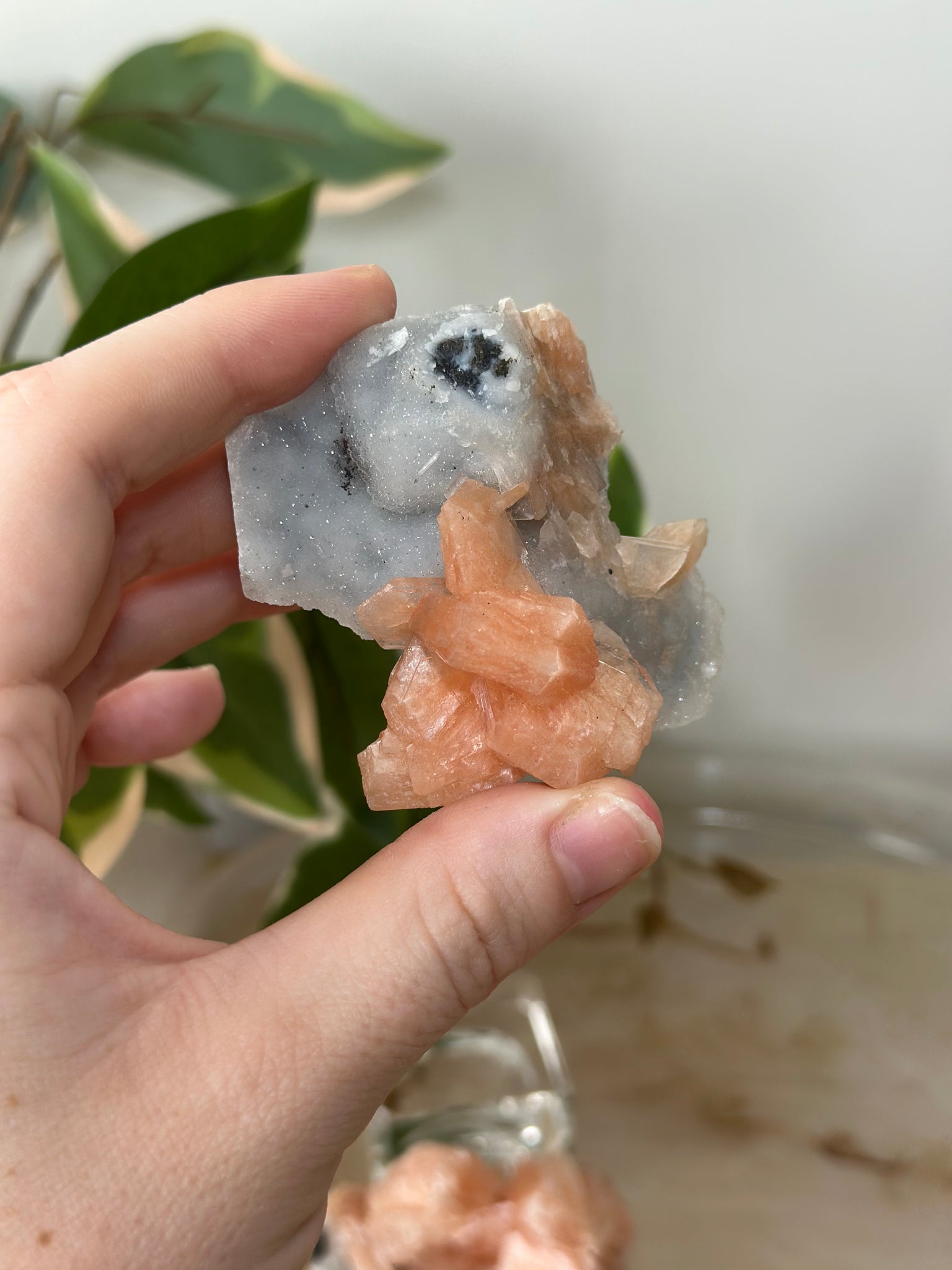 Sugary Peach Stillbite On Vibrant Blue Chalcedony Specimen #49